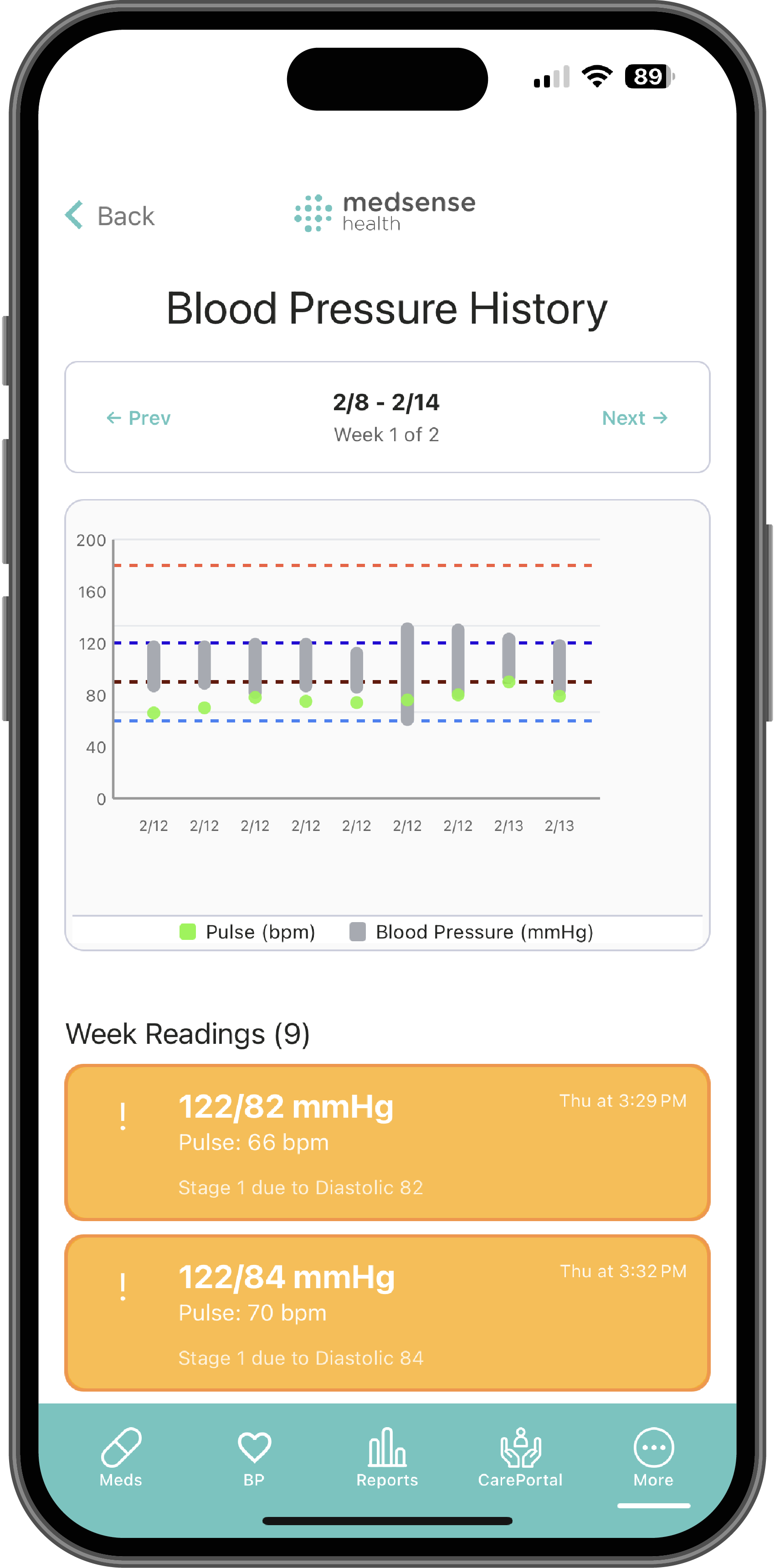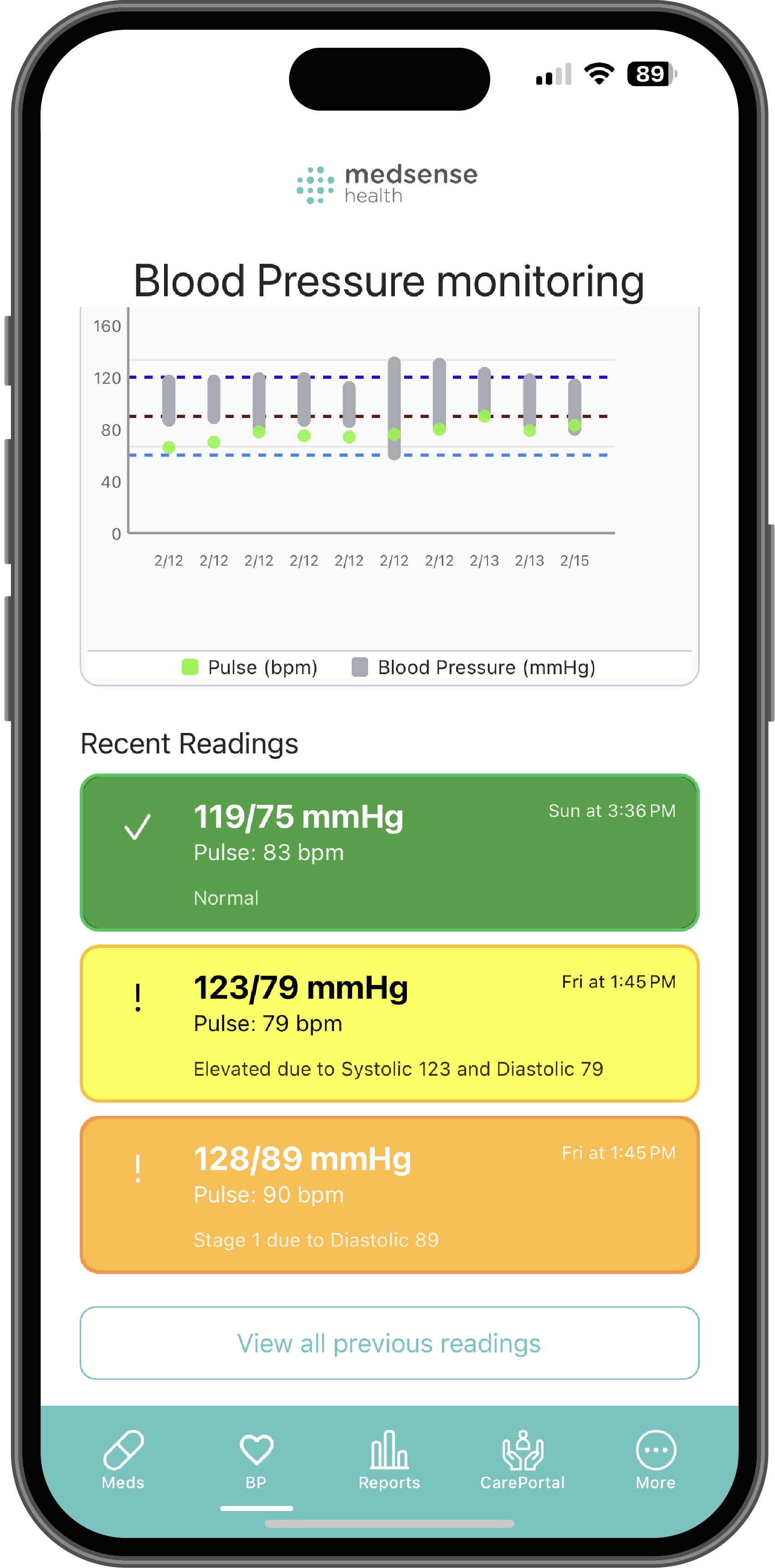 The Medsense Health Hypertension Program helps you track your blood pressure from home using a smart monitor that automatically records your readings. Combined with ongoing medication adherence support provided by your local pharmacy or the Medsense clinical team, the program makes it easier to stay on track and share meaningful insights with your healthcare team.